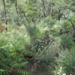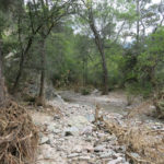 This is one of the wettest parts of the mountains – there’s a sheep drinker with two large water tanks at the head of the plateau, and I’ve found water in the stream more often than not. But underscoring what a dry year this has been, the only evidence I found of water was a patch of damp sand below a discontinuity in the rock, midway up the streambed.