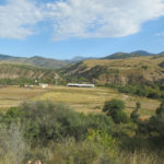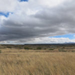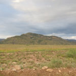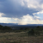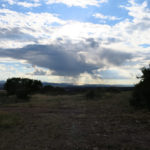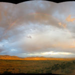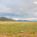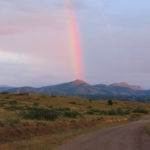 I’d no sooner started driving the badly eroded ranch road down the mesa – with the sun lowering behind distant cloud layers toward Arizona – than I noticed a partial rainbow over the mountains to the south.