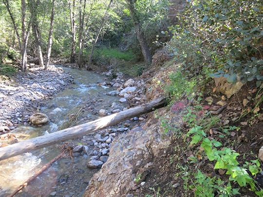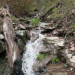 But the farther I went, the less trail was left. What made this trail bad to begin with with – the narrowness of the canyon forces it to stay in or near the creek – means that when there’s a bad flood, the trail just gets wiped out, and the going gets very tough, since you have to find your way over, under, or around an obstacle course of shattered logs and boulders while trying to stay out of the rushing, foaming water.