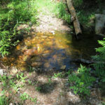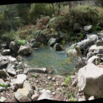 For over a hundred feet, the creek flows over bedrock – the ubiquitous white volcanic conglomerate – and over time, it has carved tublike hollows on its way down a gentle grade. The upper stretch is flat, then it pours over a little falls into the first pool, which leads into the second, which is bathtub-shaped and about 4-1/2′ deep. The overflow goes over another flat stretch and into a larger pool that’s at least 6′ deep.