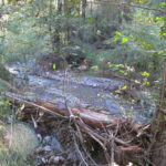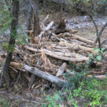 I crossed the rushing creek and found a logjam hanging six feet above the current creek level on the other side – that’s how high the flood had reached here.