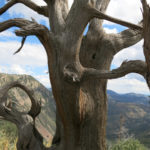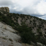 Just before reaching the big outcrop, I came to a little ledge featuring a couple of wind-sculpted junipers – a dead one and a live one that offered enough shade for me to rest a while and enjoy a snack.