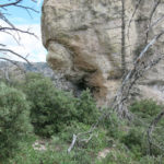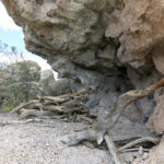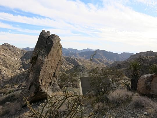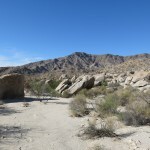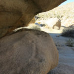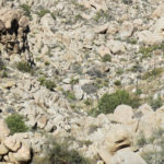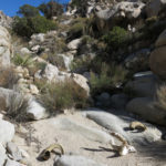 Near the head of the canyon there’s a raised bench or ledge a hundred feet above the south bank of the streambed, marked by a dramatic boulder pile. On that ledge is the most important prehistoric site I’ve found on the west side of the mountains – a truly magical place, the western counterpart of the sacred site on the east side. My sometime friend, the Mojave Preserve archaeologist, said it was most certainly used in girls’ puberty ceremonies. It consists of a large overhanging boulder, with a smaller boulder forming a sort of table under the overhang, and “cupules”, little bowls, ground into the stone tabletop, which he said were used to mix face paint.