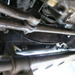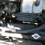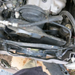 A radiator is a tight fit! It took a lot of wiggling and jiggling to get it to slide all the way down in its channels, between the A/C condensor and the stiff plastic fan housing. Everything around my old engine is slathered in oil, so working with mounting bolts and hoses underneath was a messy job. And there was a lot of stuff in the way, resulting in bruised and scraped knuckles.