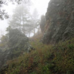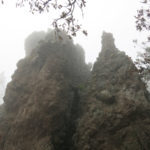 Unfortunately, the first of those two little peaks turned out to consist completely of talus – large, sharp, loose rocks – colonized by dense thickets. And while I was fighting my way through that, a light rain began to fall. Hanging to the branches of shrubs on that perilous talus, way up in the sky, I climbed precariously to within a few yards of the peak, then scouted a few dozen yards to left and right for an easier route around, only to conclude it was just too dangerous to continue.