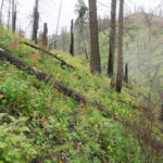 And at the bottom of the long traverse into the canyon, I began to glimpse fallen trees and a new debris flow in the bottom. The flood had pushed shattered trees way up the bank on each side.