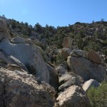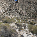I believed the head of the side canyon was due south of me. I couldn’t see the actual crest, or a saddle which might be my point of access, because of intervening spurs of the mountain, but I could see a drainage that might be my way up. Much of it was boulder-choked, but I could also see some patches of bare, shrub-dotted ground that might provide an easier route. It would be an experiment.