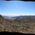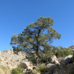 The plateau, which I’ve always considered the heart of the entire mountain range, is a rugged, rolling basin partly enclosed by steep boulder slopes at its eastern head and southern rim, and traversed by a winding streambed that drains from east to west. This area hosts most of the pinyon pine in the range, from the rim down to the wash itself.
