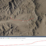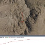 The day was almost perfectly calm in the wash, and when I reached the outlet of the old road up to the mine, which I hadn’t visited in decades, I decided to head up there. The lower part of the road remains in good repair, and as I climbed, I encountered some nice gusts that kept me from overheating. But the road gains 500′ in elevation, becomes quite steep, and crosses a drainage where it’s been eroded beyond driveability, sometime since the early 90s.