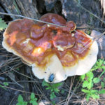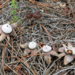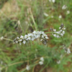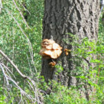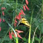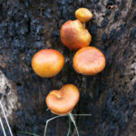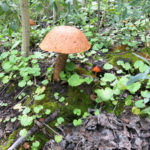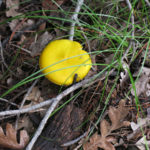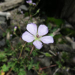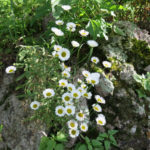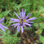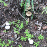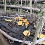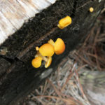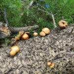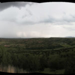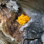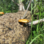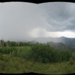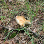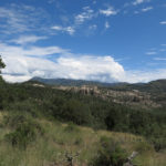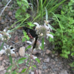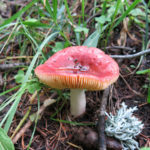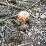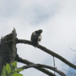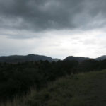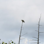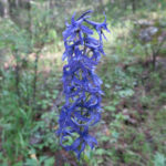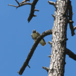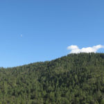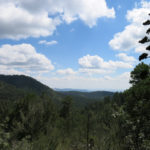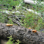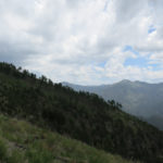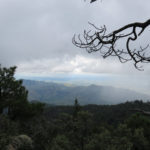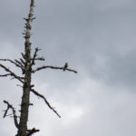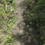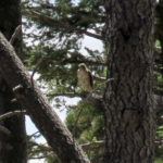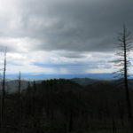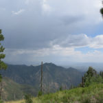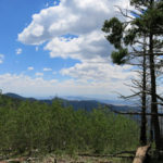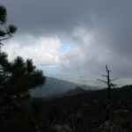 The long descent gave me an opportunity to watch storms developing far away across the landscape, as well as to appreciate flowers and fungi I’d missed on the way up. Just below the peak, I surprised a small hawk from the slope just above the trail. It first thought to perch on a seedling right in front of me, then decided it was too close and soared away to a much farther branch, so I couldn’t get a good picture.
