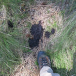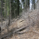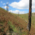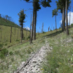 Northwards past the peak, the trail reaches the edge of the 2014 wildfire, dropping toward a saddle through alternating burn scar and surviving stands of mixed conifers. Here, I found very fresh bear sign, then suddenly came upon a young couple hiking up from the saddle, where the trail meets the gravel road to the nearby fire lookout.