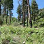 The first stage is down the gully of a dry, vegetation-choked hanging drainage that you can’t see out of. This gets tighter and tighter, finally leading to a patch of shady mixed-conifer forest with such a shallow slope that it feels like a plateau.