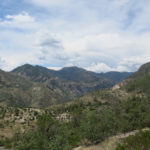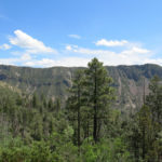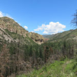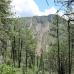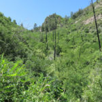 About another mile along the ridge, the trail begins descending steeply into the canyon, through burn scar regrowth, across erosional gullies, over more fractured white rock, much of it exposed with spectacular views of high peaks and multicolored cliffs of volcanic rock on the opposite side. I kept pushing the head net up from my face, thinking the flies were gone, only to have them return in swarms, dive bombing my eyes and nose.