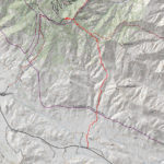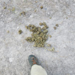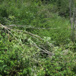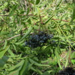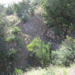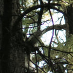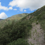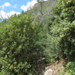 When I reached the switchbacks that take you to the high pass into the hanging canyon, I found a real puzzle. I was already fighting my way through thickets of thorny locust when I came upon big branches of elderberry that had been torn down, so that they blocked the trail and had to be climbed around. Dozens of mature branches, a dozen feet long and over 2″ thick, had been violently broken off, far back from the trail, requiring a long reach and a lot of strength. More strength in many cases than a human would have – and there was no sign humans had used this trail during the growing season, and why would a human pull down vegetation to block a trail anyway? It could only be bears, but bears don’t eat elderberries – all the berry clumps on the branches were intact.