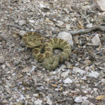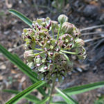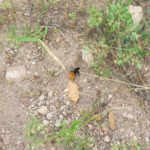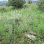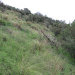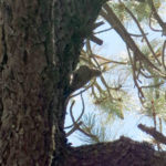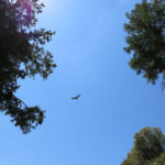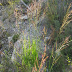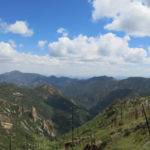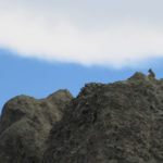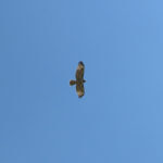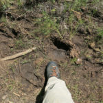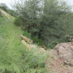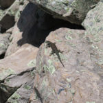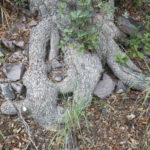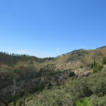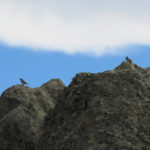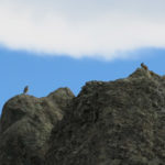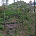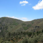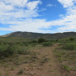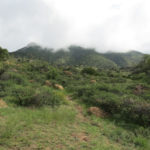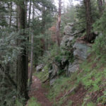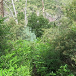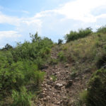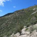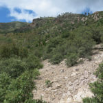Past the saddle the trail begins traversing further east around a series of rounded slopes through moonscape burn scar which has filled in with shrubs and annuals. Here I was joined by the hawk again. Why? Normally a hawk will only pay attention to a human if it has a nest nearby, but this hawk was stalking me a quarter mile from where I’d first seen it.