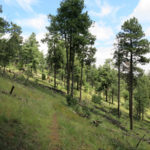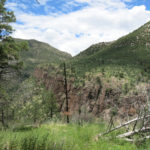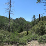 On the down side, with the exception of one short canyon passage, it’s the least spectacular of my hikes. You’re mostly hemmed in by forest, and when you’re not, you’re crossing burn-scarred slopes with only nearby views of featureless forested mountains. I end the hike at a “park” – a shallow bowl on the crest of a ridge with tall ponderosas around the edge and a grassy clearing in the center.