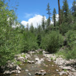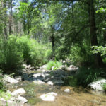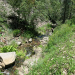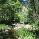 At the bottom you enter the riparian forest, with ponderosa pine forming the canopy and dense scrub willow lining the creek. In this very narrow canyon there’s no floodplain, and after crossing on stepping stones to the east bank, the trail continues upstream through the lush riparian forest for another third of a mile.