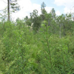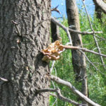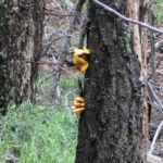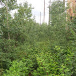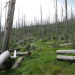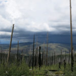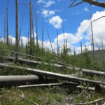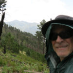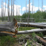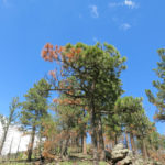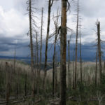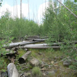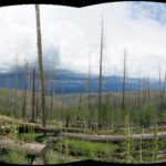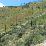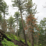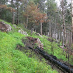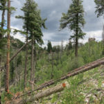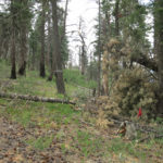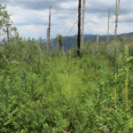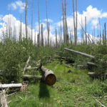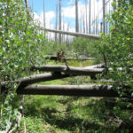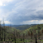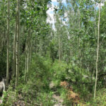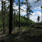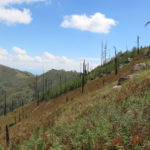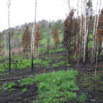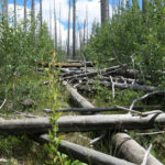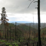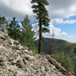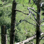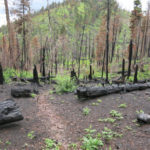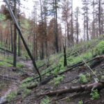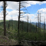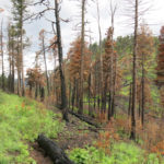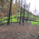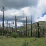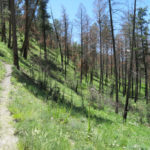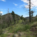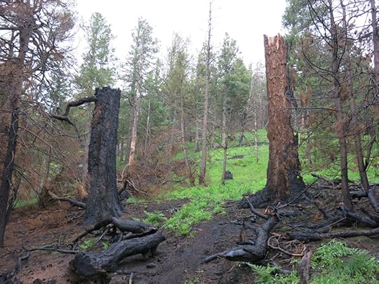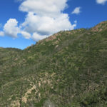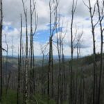 The peak forest is an island. Forest on the slopes below it was destroyed in the 2013 fire, and the trail there is crowded with seedlings of thorny locust and aspen. Some of this survived this year’s fire – enough to really slow me down.