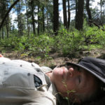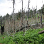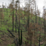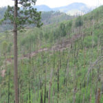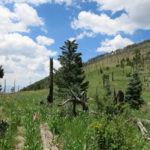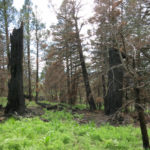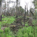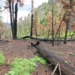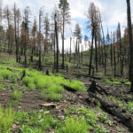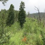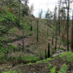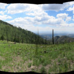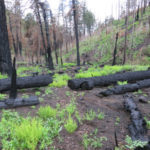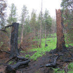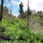But when I traversed around the peak through the lush forest below the lookout, I became confused. This area alternates between dense stands of fir and small grassy meadows surrounding isolated stands of venerable pine, fir, and Gambel oak. Here, many firs had been killed while their immediate neighbors had been spared. As before, there were small black bare spots where ground fires had burned with high intensity, but hadn’t seemed to have spread. The more I looked, the harder it was to tell where and how the fire had actually burned, because most of the ground cover was grass and forbs, which could’ve come up after the fire.