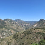 The climb to that peak, on dozens of short switchbacks in loose rock at an average grade of 30%, is one of the hardest parts of the hike. Fortunately, it’s only 400 vertical feet! But when you get up there you have the most expansive views of the entire route: north to the crest of the range, east to the heart of the wilderness, west to the mountains of Arizona. This little peak forms the western edge of the rolling plateau you cross to reach the second canyon.