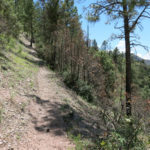Less than a mile up the “road” past the midpoint, you reach the hiking trailhead. From there, you wind and switchback up the densely forested side of the canyon to a long level ledge through parklike forest. That takes you to the upper part of the canyon, where the trail rejoins the creek and climbs steeply to a forested saddle where it joins the CDT.