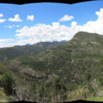 Crawling over shelves of rock, slowing for steep sections and erosional gullies, watching carefully for approaching vehicles – including big trucks towing trailers – that I may need to stop or back up for, I finally reach the crest, at over 9,000′. Here, after our exceptional monsoon rains, a section of the road is flooded to 9″ deep, a muddy lake almost high enough to reach the door sills of my vehicle.