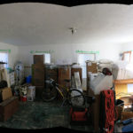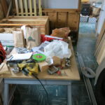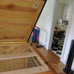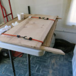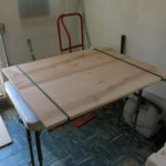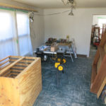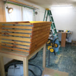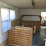 I cleared out the workshop as much as possible, but the flat file cabinet had to stay there while I put in the wiring – it was too big to fit through the casita’s other doors. So I worked around it, moving it from place to place as needed.