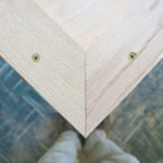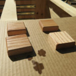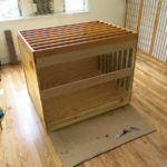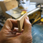 The base of the cabinet was the crudest part of it – inconsistent with the rest of the thing, the base was made out of rough, construction-grade two-by-fours. I wasn’t going to have that sliding around on my newly refinished oak floors, so I had to make feet, to which I would attach protective felt. I made these out of scraps of oak from another project, plus I cut corner guards to protect the vulnerable bottom edges of the cabinet, where the chip had come off earlier.