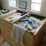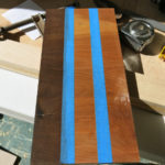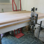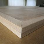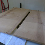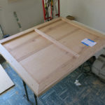 We didn’t have any cabinet-grade wood panels available locally to cover the entire top, but I finally figured out a way to combine two different woods without more expensive tools. In addition to the oak boards, the lumber yard had a few 24″x48″ cabinet-grade pieces of birch plywood with a nice surface grain, and I was lucky to find two pieces that were book-matched.