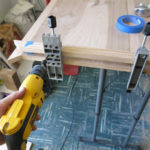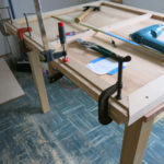I used the oak as edge binding and to join the two pieces of plywood down the center. I still didn’t have long clamps, but I managed to get enough pressure using bungee cords, and a doweling jig, to get reasonably fine joinery.
