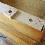 So I cut a couple of oak boards as cross braces for the body of the cabinet – they would just barely fit above the top drawer, and would stabilize the cross member in front, as well as to prevent warping of the sides. They would also need to be removable to facilitate getting your whole body inside the cabinet to work on the slides!