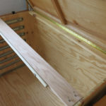 But how to prop up the hinged top so I could work inside the cabinet? I hadn’t included that in my design yet, and there wasn’t much room to work with inside the cabinet. After a few days of design experimentation, I came up with the solution you see below, which works great.