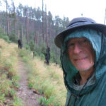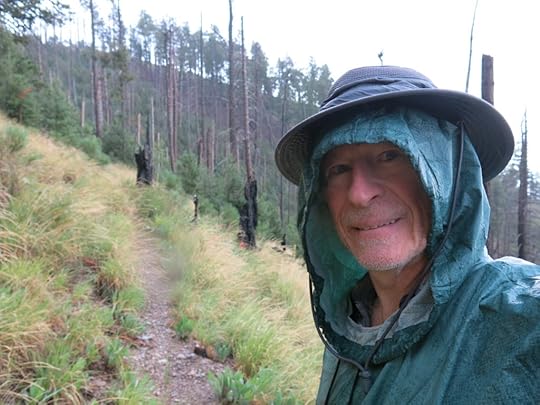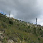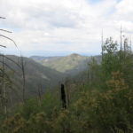 The trail through this canyon had been cleared of logs just last fall – 8 years after the 2013 fire – and now it was rapidly being eroded away. As usual, it was only my past familiarity that enabled me to follow it. Slowed down by all the fire damage, I only made it to the second saddle – a mile short of my destination. The rain had finally stopped, and despite frequent thunder from surrounding storms, I could pack away the poncho for the rest of the hike.