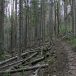 The CDT crosses eastward to another densely forested watershed, where it traverses in long switchbacks up a south-facing slope to the 9,000′ peak. Apart from short rocky sections, this is mostly a smooth forest trail on packed dirt, so I was able to make good time.
