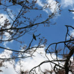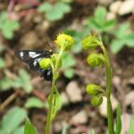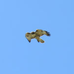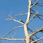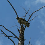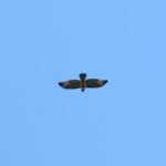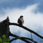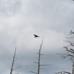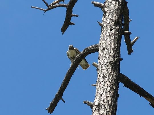 Shortly after leaving them I felt a shadow passing over and figured it was a vulture. Instead, I saw a large hawk just settling into an upper branch of a low snag next to the trail, to peer down at me curiously. We watched each other for a while, then I continued, finding the couple’s vehicle at the road, with a New Jersey plate.