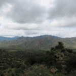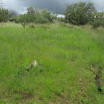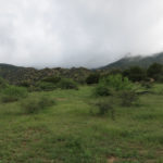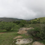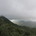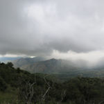 It was a perfect day for this hike, because it’s generally too hot in summer, but today’s cloud cover would fix that. Sure enough, it was in the 60s when I set out from the trailhead, through an overgrazed maze of boulders, mesquite, and big Emory oaks. But the humidity was almost 100% and the head-high vegetation was dripping from overnight rains. So I in addition to waterproof boots, I put on my waterproof, thornproof hunting pants and left my regular hiking pants in the car.