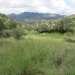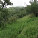 This trail is very seldom used by anyone other than me, and the last time I’d been here, in March – long before the growing season – I’d gotten lost because the tread vanishes at many points. I knew it would be overgrown after this year’s long, wet monsoon, and it exceeded my expectations. Beyond the flood crossing, I was wading almost continuously through sopping wet chest-high grasses. The crest was still hidden behind clouds, but at least it wasn’t raining – yet!