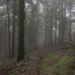 My destination, the mountain crest, was completely obscured by low clouds. And as I approached back and forth through the lowland maze, I was accompanied by the freight train sound of a raging flood not too far off on my right. I was surprised because it wasn’t raining, and I didn’t think any of the drainages near this trail had big enough watersheds to flood. But the trail led me away from the sound and I thought no more of it.
