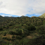 By the time I faced the brutal climb out of the second canyon, clouds had extended over it, giving me welcome shade. But in my compromised physical condition, it was still brutal and seemed to take forever – up the precipitous, rocky, seemingly endless switchbacks, up the claustrophobic, vegetation-choked drainage, and on the final climb in loose dirt at a 40% grade to the saddle at the top, where you face the steep descent on the chaotic eroded slope into the shallow hidden valley. Reaching that saddle felt like a major step forward in my recovery! I might not be able to hike as fast as I could a few months ago, but I could plod my way up the steepest slopes.