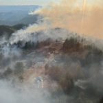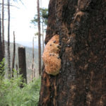 And at the bottom, a trail junction and saddle where some tall ponderosas had survived the 2013 fire, this year’s fire had burned hot. The tree holding the trail signs had been torched – its charred trunk lay on the ground, and the trail signs had apparently burned to ashes. I’d often stopped at this saddle for a shaded lunch or a few minutes’ rest, but it was a bleak place now.