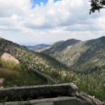 I always forget how bad the road is. It begins at 5,000′ as a paved 2-lane in good condition. It climbs onto a flat mesa at 5,600′, at the end of which it begins the serious climb, turning into a one-lane with blind hairpin curves and sheer drop-offs with no guard rails. Here, the rough pavement is littered with rocks that have fallen off the cliffs above.