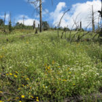 Climbing the final switchbacks to the peak, I finally came upon scars of this year’s fire. Here, they were simply small black bare patches in a sea of lush annuals – it looked as if windblown sparks had started spot fires that had burned out without spreading.