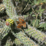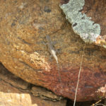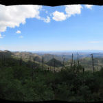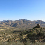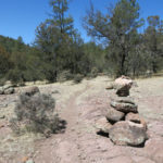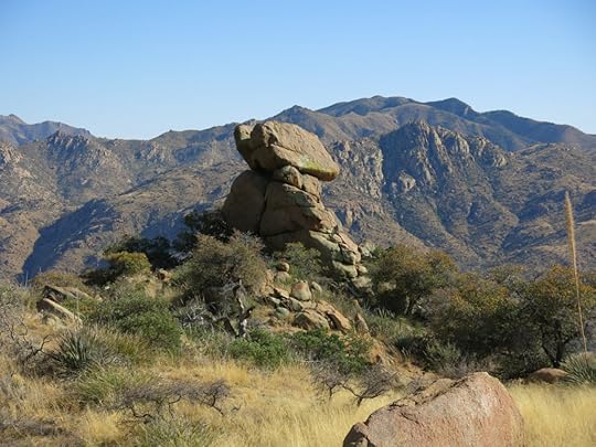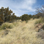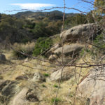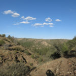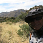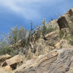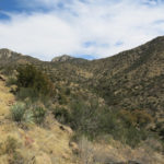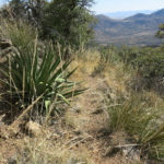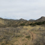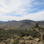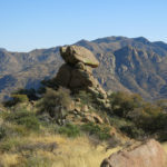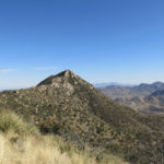 The day felt hot from the beginning. My memory of this place was rusty, and things had changed in the eleven months since my last visit. The steady climb that yields spectacular views is exhausting, and last summer’s wet monsoon had resulted in overgrowth of the trail by grasses and shrubs. Near the bottom it was thorny mesquite that scratched my hands and made me especially grateful for thorn-proof pants. Since virtually no one besides me hikes the full trail, grasses had obliterated much of the tread and hid rocks that kept throwing me off balance. Game trails often had more tread than the hiking trail, so I really had to rely on memory and cairns, which were themselves sometimes buried in overgrowth.