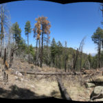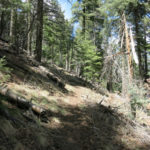 The trail climbs steadily, at a gentle grade, through the burn scar of the 2013 mega-fire. That fire had burned at high intensity over most of this area, and the remaining snags continued to topple and block the trail, which now had an abandoned feel.