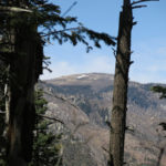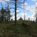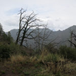 The farther I went, the more the ground had been fouled by cattle. I had to walk carefully to avoid the deep pits made in the mud of the trail by their hooves. Saddles between peaks had been turned into churned-up mudpits, and even on steep grassy slopes the ground was an obstacle course of rain-softened cowpies. After dealing with that and fighting my way over all that deadfall and blowdown, I finally neared the base of the peak, and the rain began.