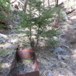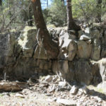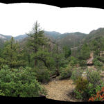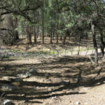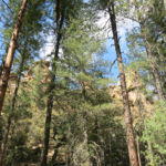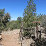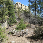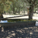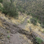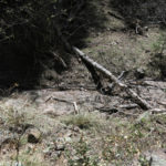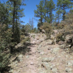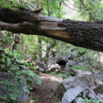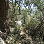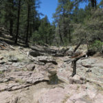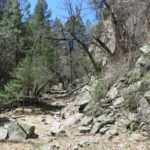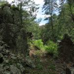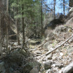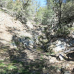 Eventually, instead of cliffs and rock formations, I began to glimpse blue sky through the trees above, and believed I was nearing the top. But after a few more turns and long traverses, I found myself again in the bottom of a narrow, rocky canyon. There I found a rusted, empty water trough half-buried in debris. And after crossing the canyon bottom again, I faced the steepest trail I’d seen yet. Surely this must be the final climb? I’d been hiking for five hours, which would normally take me more than ten miles. But coming this far, I just had to see where the steep trail led.