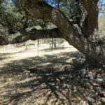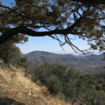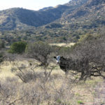 Nobody had driven that 4wd track recently, but it’d been fully trampled by cattle. The boulder-strewn base of the mountains alternates between meadows, dense scrub, and giant old Emory oaks, and the trail meanders between them while climbing gradually into the complex topography of the foothills. I could hear the cattle before I saw them – they were grazing a grassy basin to my left – then while stopping to stretch I was surprised by a cow and her calf emerging from the oak scrub a few yards away.