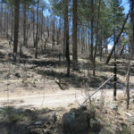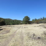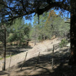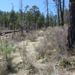 But nearing the top of the steep stretch, I suddenly emerged into a zone of strong wind, and was convinced I was nearing the crest, where wind would strengthen due to the funnel effect. And after traversing an overgrown burn scar, I finally came upon a fence and the dirt forest road. I’d seen no sign of the CDT junction – I’d misinterpreted the topo maps.