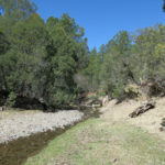 Through the gate and over the saddle I got my first and only view into the next canyon. The trail was heading down the north slope of a small, densely forested basin, at the far end of which I could glimpse some kind of small grassy clearing. The trail quickly deteriorated into a very steep, rocky erosional gully, in which I slowly and carefully tried to avoid stumbling down a couple hundred vertical feet through dense scrub. I began seeing cowshit, and at the bottom of the basin I entered a thoroughy trampled and overgrazed area with a fence, corral, and a small, muddy water hole. From there I followed a broad cattle trail to a running stream trampled by cattle and choked with algae, and another stock gate. I was pleased and surprised to see so much water in the canyon, but in general, this was turning into a fairly depressing hike.