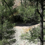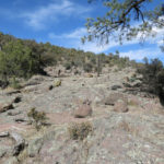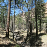 The first thing I encountered was a confusion of trails up a broad, dry floodplain forested with large, old pinyon, juniper, and oak and rumpled with flash flood debris. I just assumed the trails would all converge upstream and took the most direct routes. After a quarter mile they did converge and began climbing the left slope. But that slope turned out to be laced with a dense network of intersecting trails, like the diagonal grid of a chain-link fence, and they all showed heavy use, so it was initially hard to figure out which to take. Most were clearly animal trails, but I saw no cowshit so I was initially mystified.